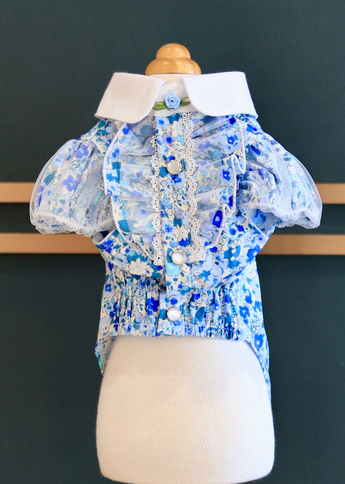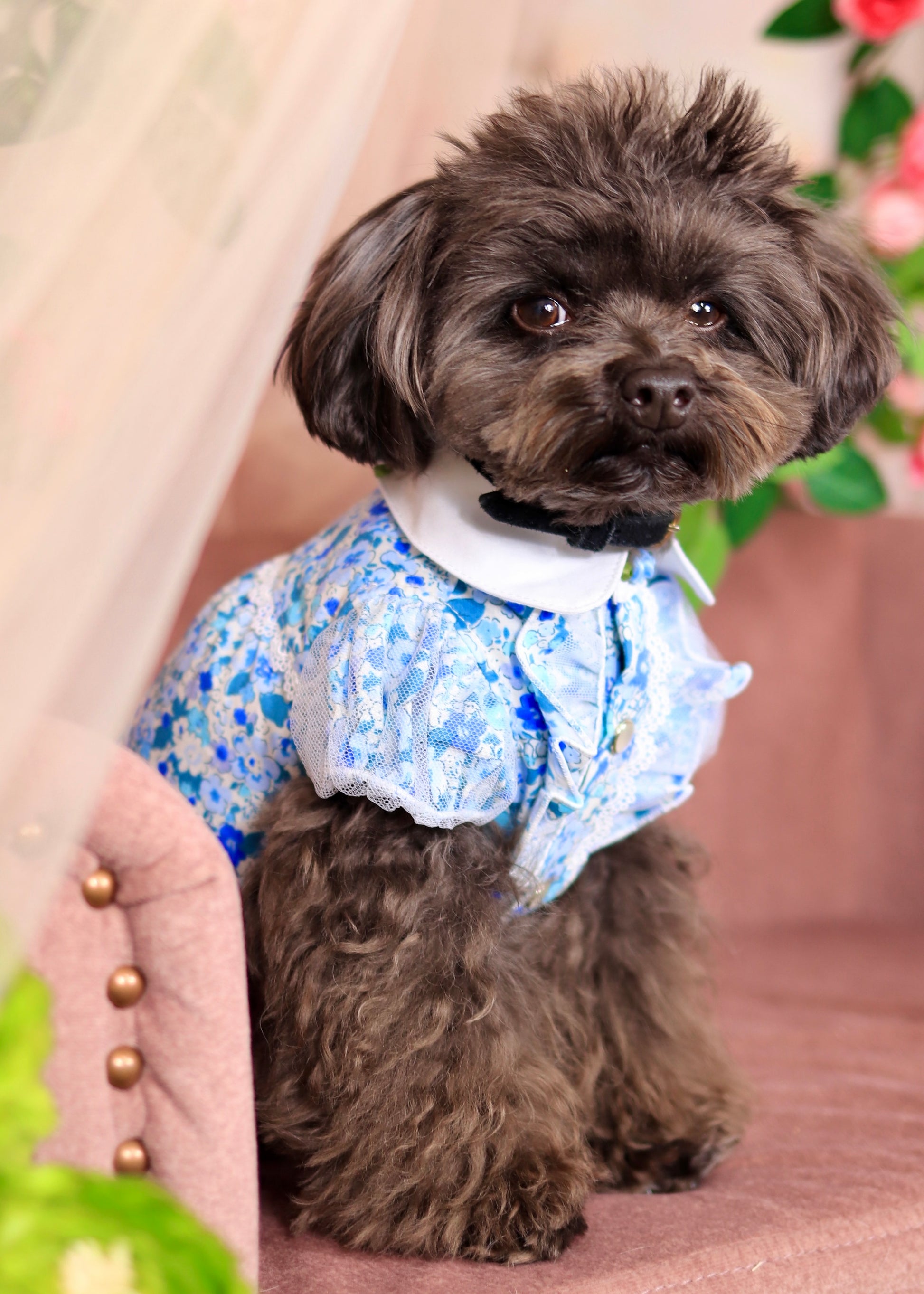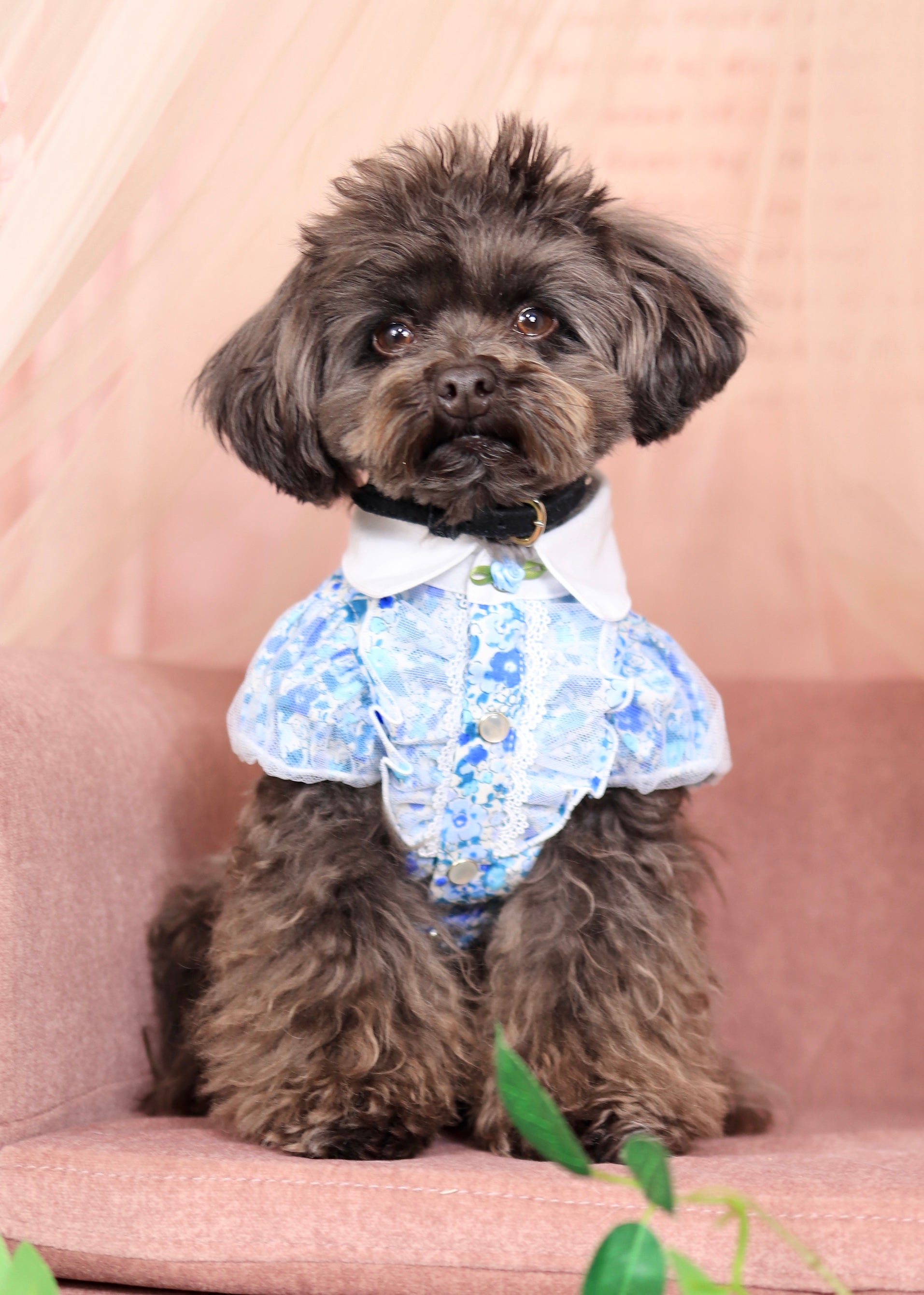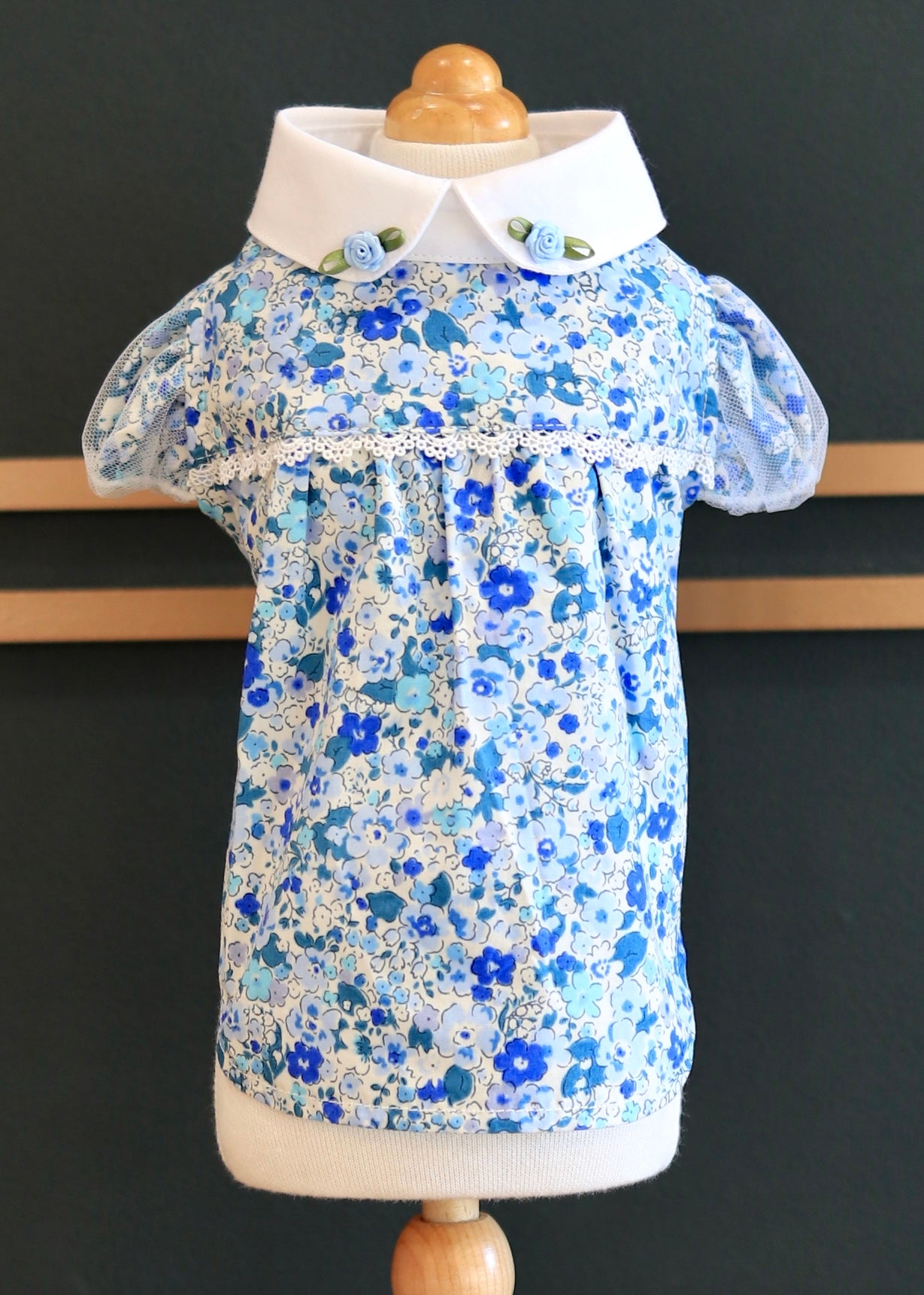 お袖は小花柄プリントの生地にチュールを重ねふんわりとさせ、胸元にはリボンの薔薇と繊細なチュールレースのフリルが柔らかく光るボタンを囲うように施されています。わんちゃん猫ちゃんの優しい雰囲気を引き立たせてくれます。