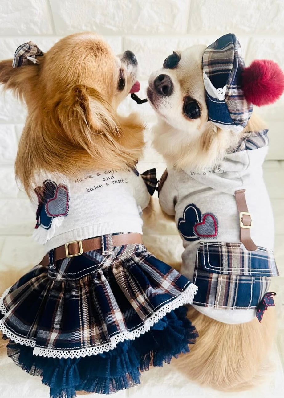 前から見ても、クマさんのワッペンが可愛いくて、ベルトのアクセントがオシャレなワンピース&トップス(^^♪